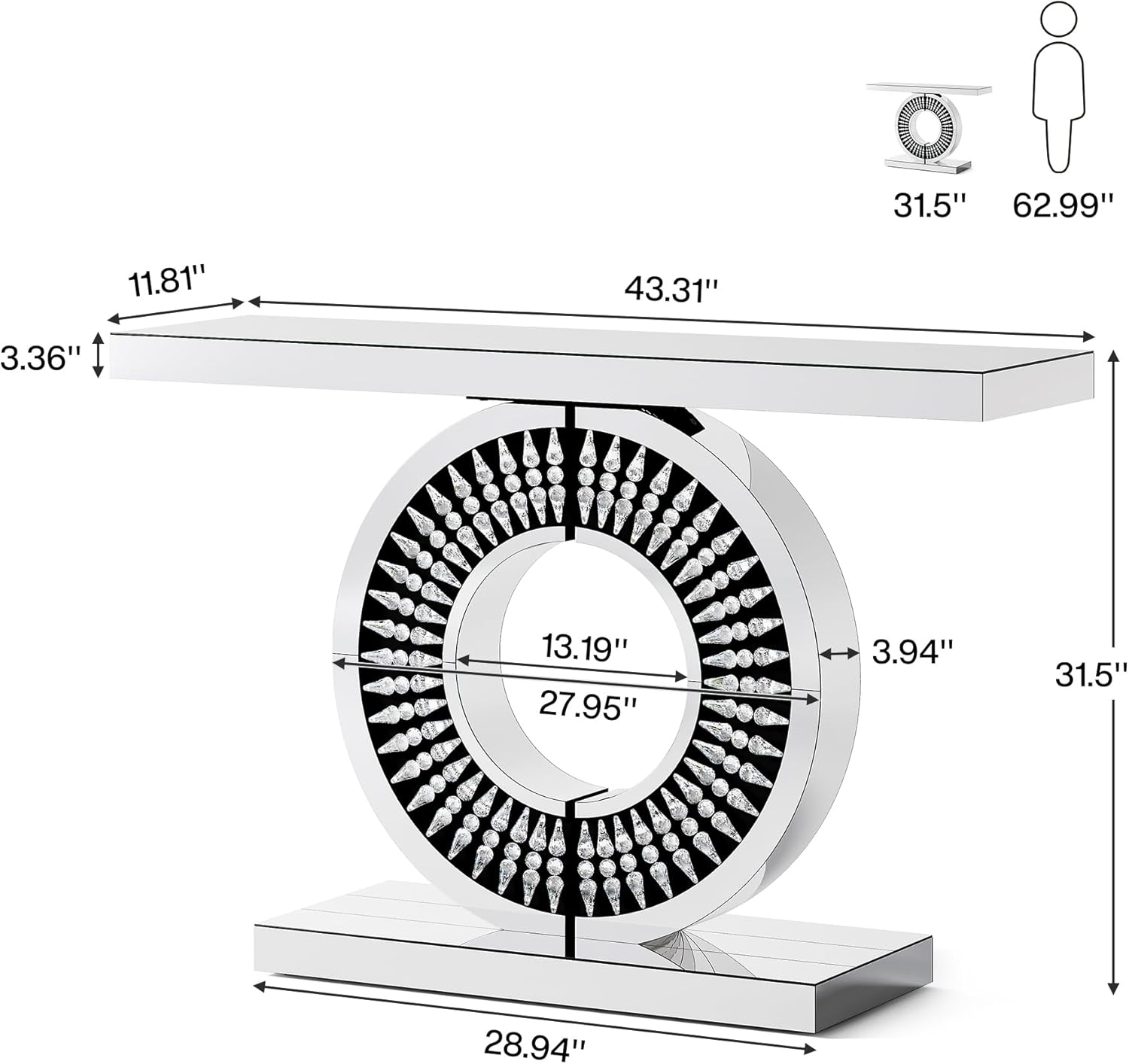 43" Silver Glass Console Table with Crystal Inlays – Modern Entryway Accent