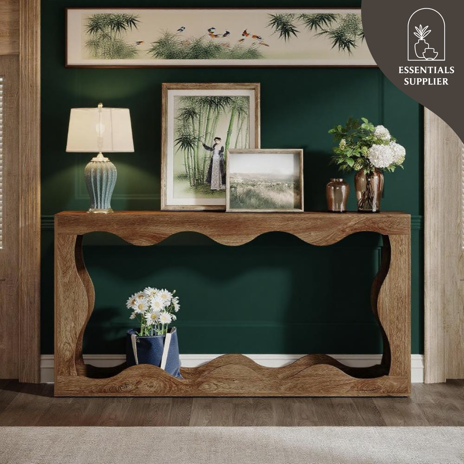 63" Light Brown Farmhouse Wavy Console Table – 2-Tier Entryway & Sofa Table