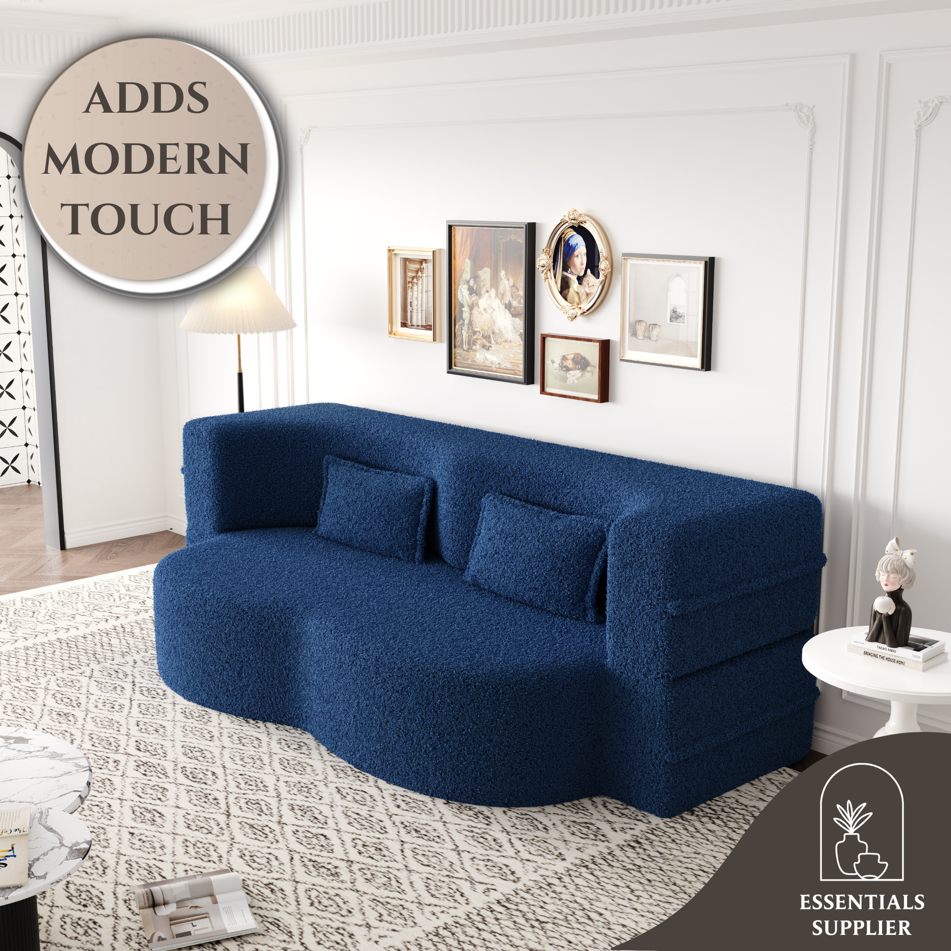 Blue Teddy Fabric Convertible Floor Sofa Bed with 2 Pillows, Full Size 78"
