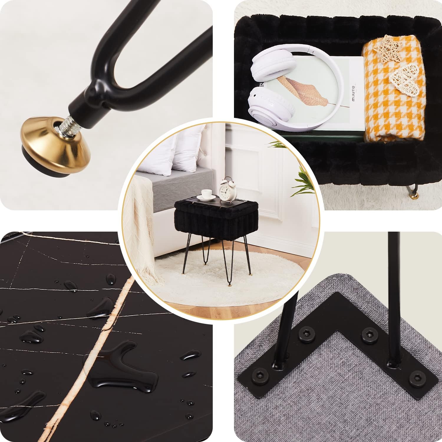 Faux Fur Ottoman with Storage – Vanity Stool & Footrest for Bedroom, Black