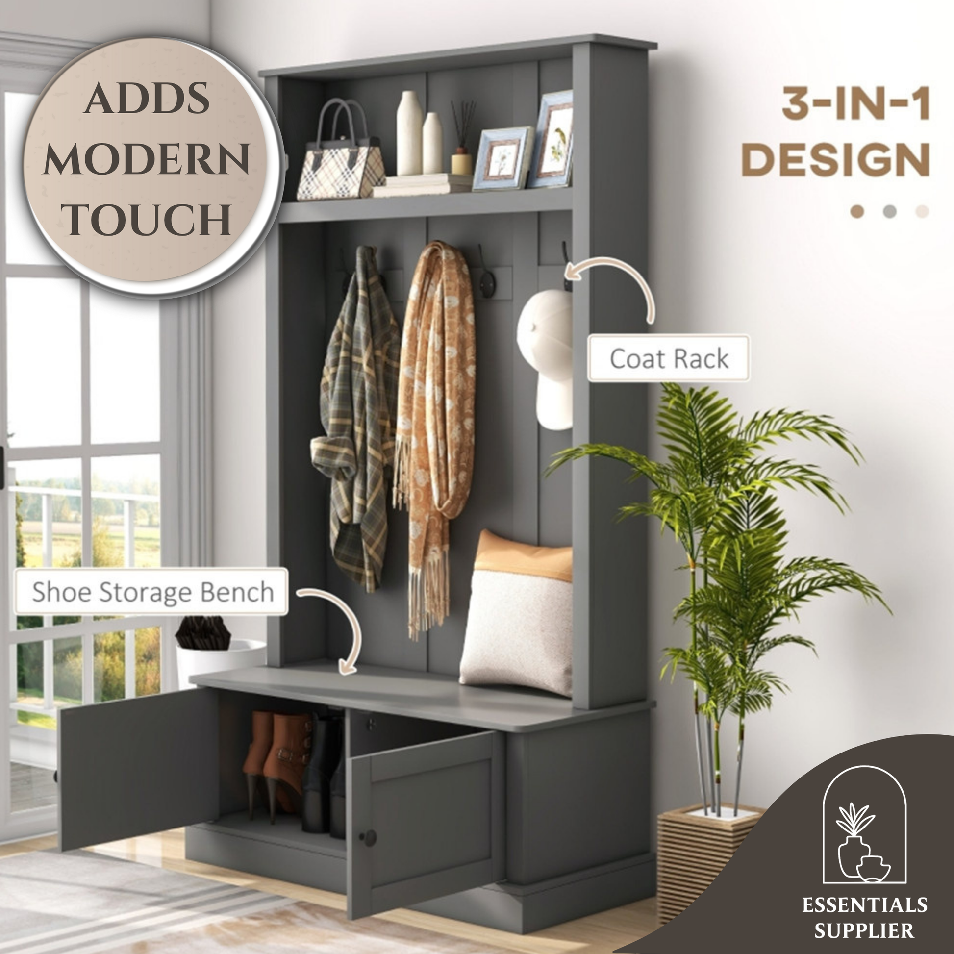Upgrade your entryway with this multi-functional hall tree in gray. It serves as both a stylish shoe bench and practical storage rack. The cushioned seat lifts to reveal a cabinet for hidden storage. Six fixed hooks keep caps, bags, and scarves organized, while the top shelf holds decor or small plants. A modern and space-saving solution, this hall tree fits perfectly in your hallway, bedroom, or living room. Crafted from sturdy particleboard with an anti-tipping design for safety. Assembly required.