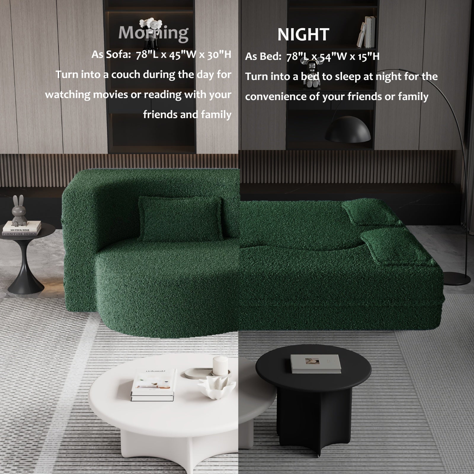 Green Teddy Fabric Convertible Floor Sofa Bed with 2 Pillows, Full Size 78"