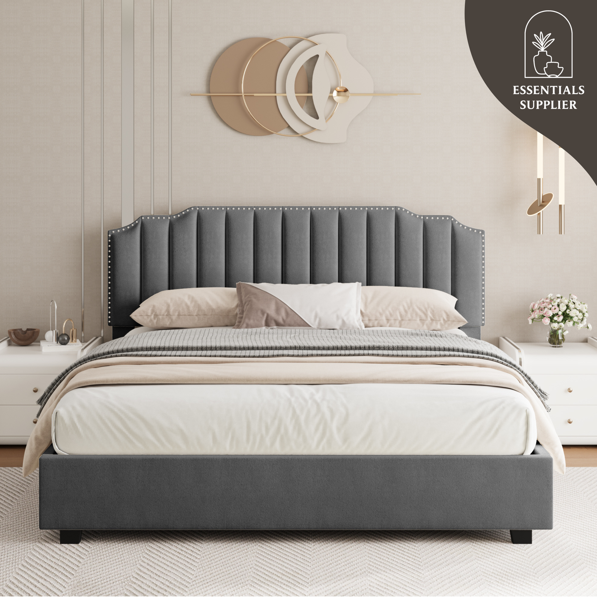 ✅ Elegant Velvet Upholstery: Upholstered in soft grey velvet with decorative copper nailhead accents and a carved headboard for a timeless look.
