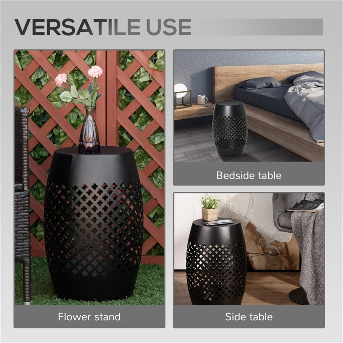 Add a stylish touch to your space with this chic black steel boho end table. Featuring a geometric cutout pattern, this compact accent piece is perfect for use as an outdoor coffee table, side table, or plant stand. Its sleek, wipe-clean surface makes it easy to maintain, while the durable steel construction ensures long-lasting use. No assembly is required—just place it wherever you need extra style or function. Ideal for patios, balconies, gardens, or even indoor spaces. Versatile, decorative, and functional, this table is a great addition to any décor.