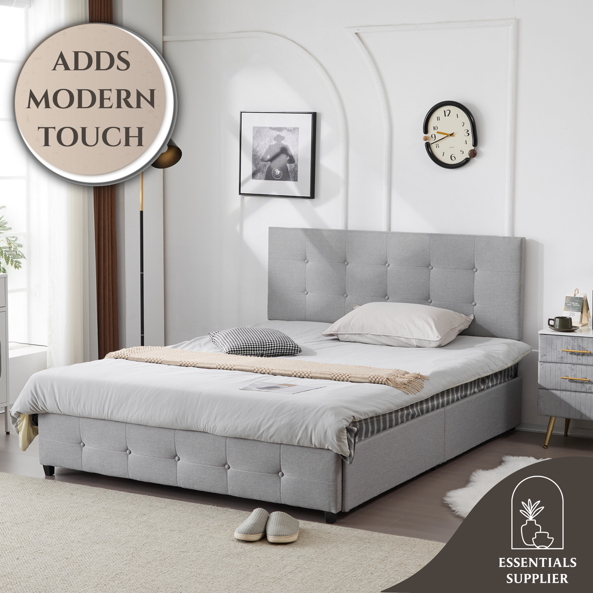 ✅ Button-tufted linen headboard adds a soft, elegant look