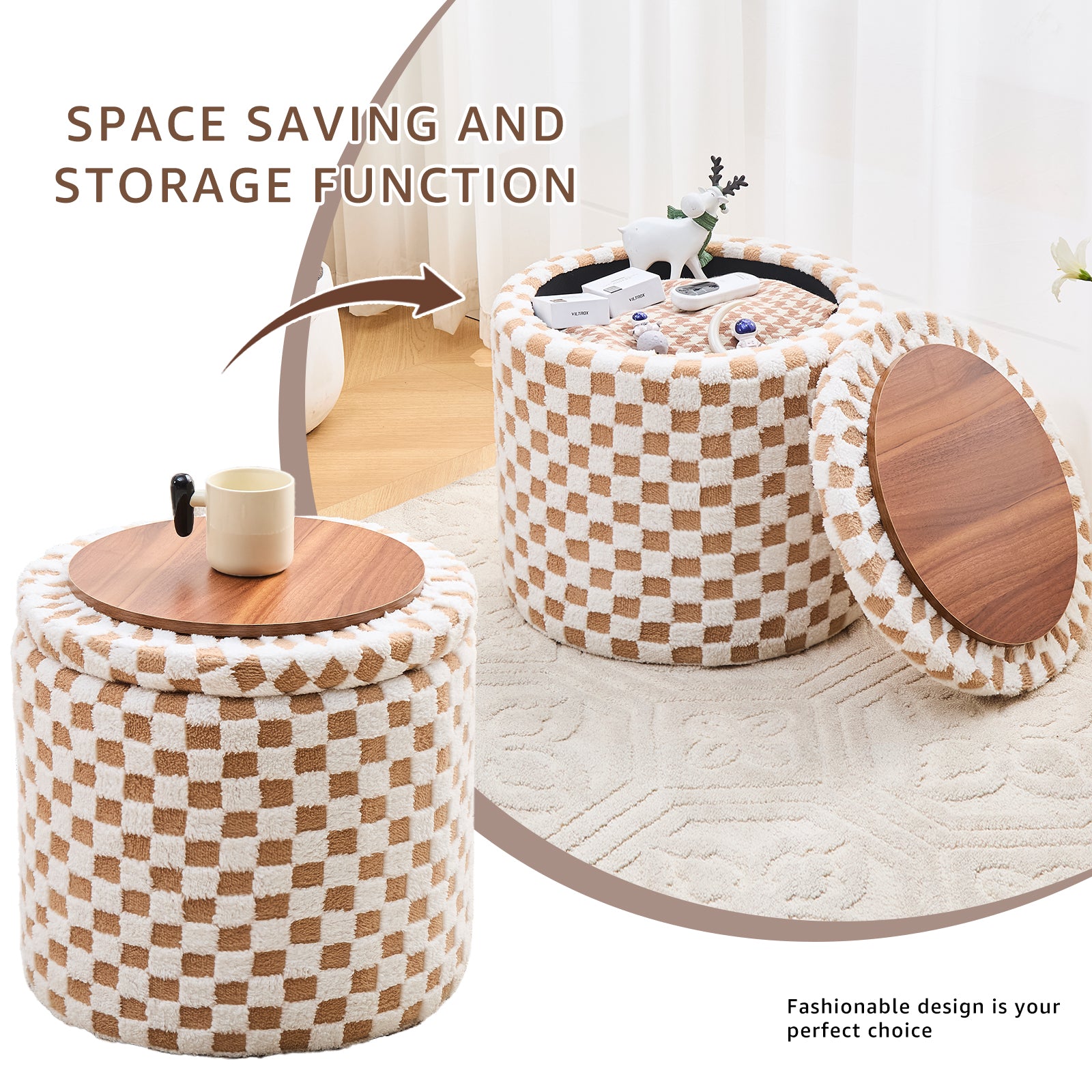 Round Brown Faux Fur Ottoman with Storage – Footrest for Bedroom or Vanity
