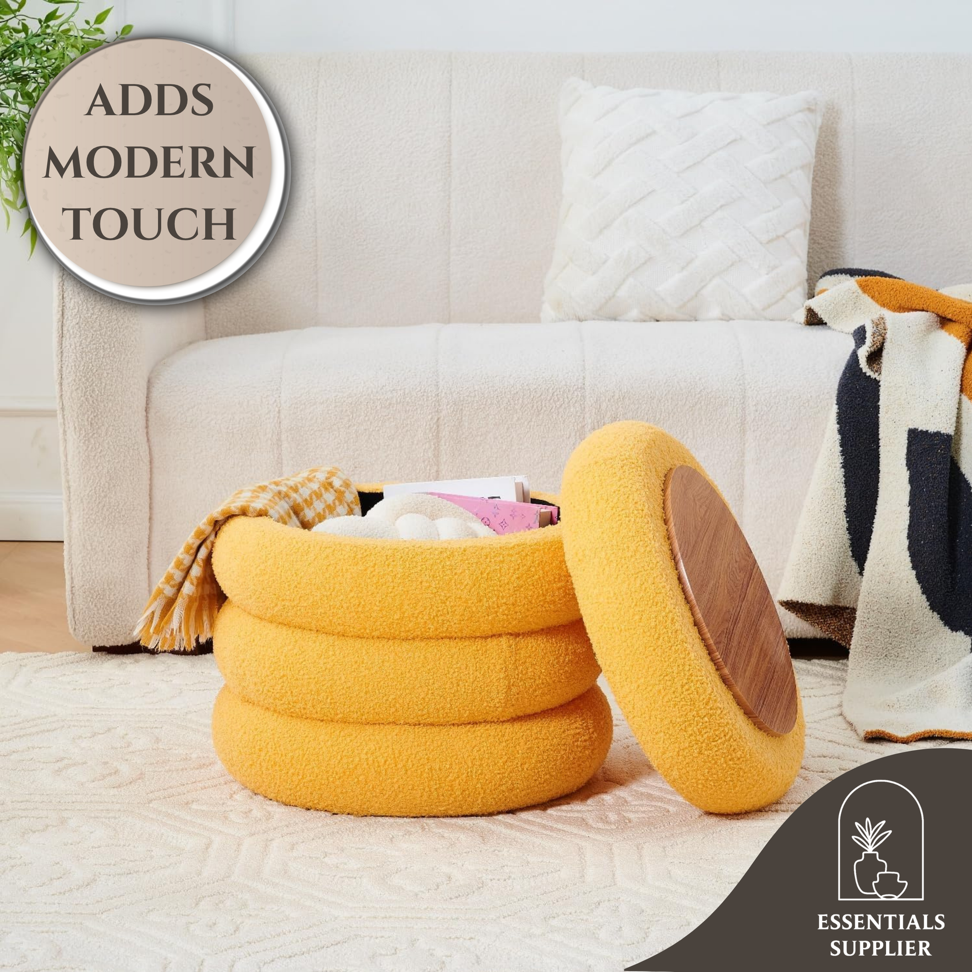 Round Shape Storage Ottoman Stool with Flip Tray, Vanity & Footrest Chair, Yellow