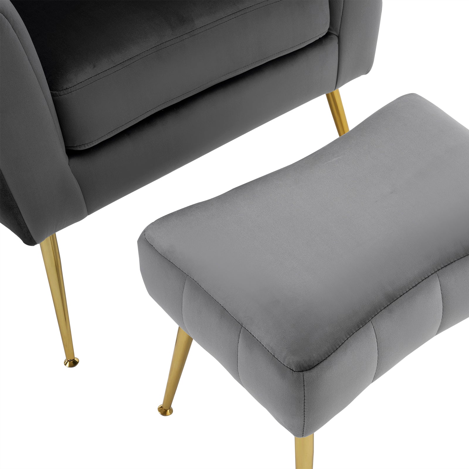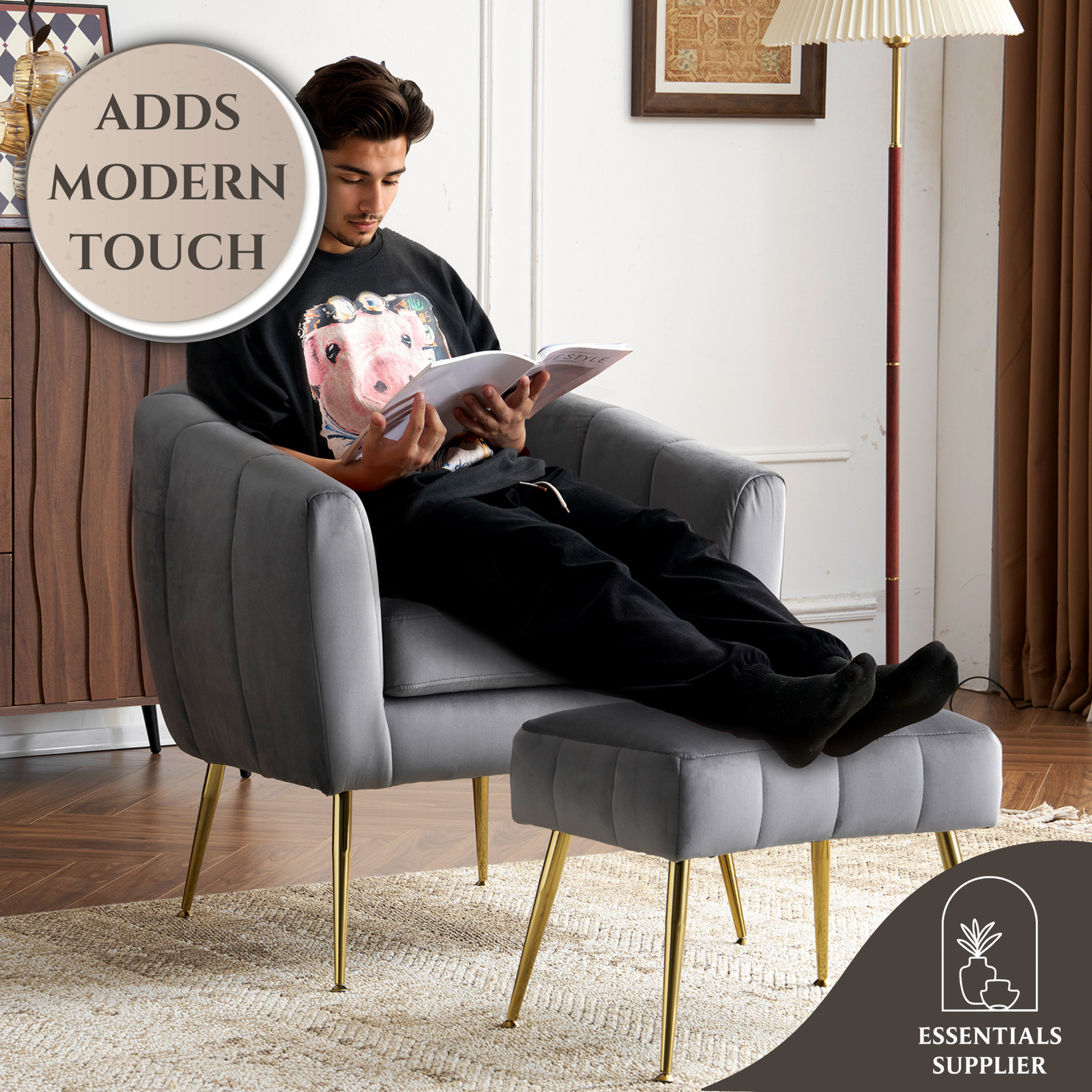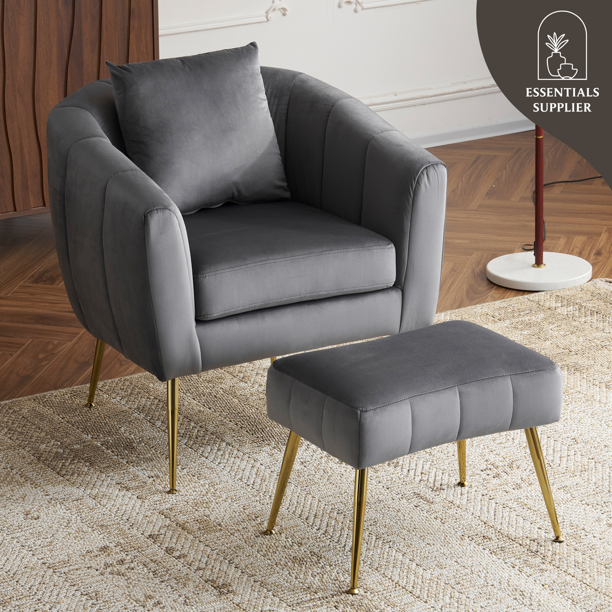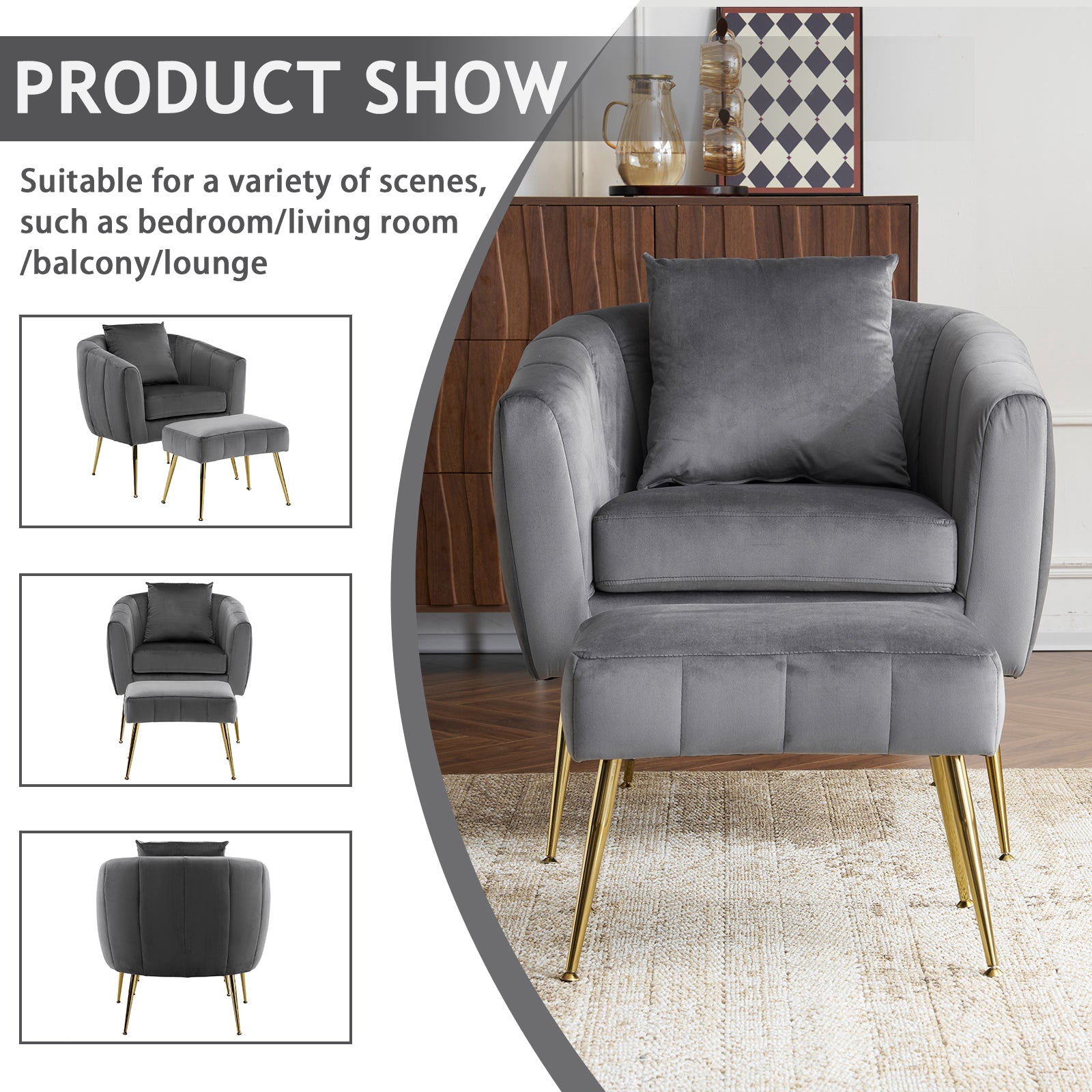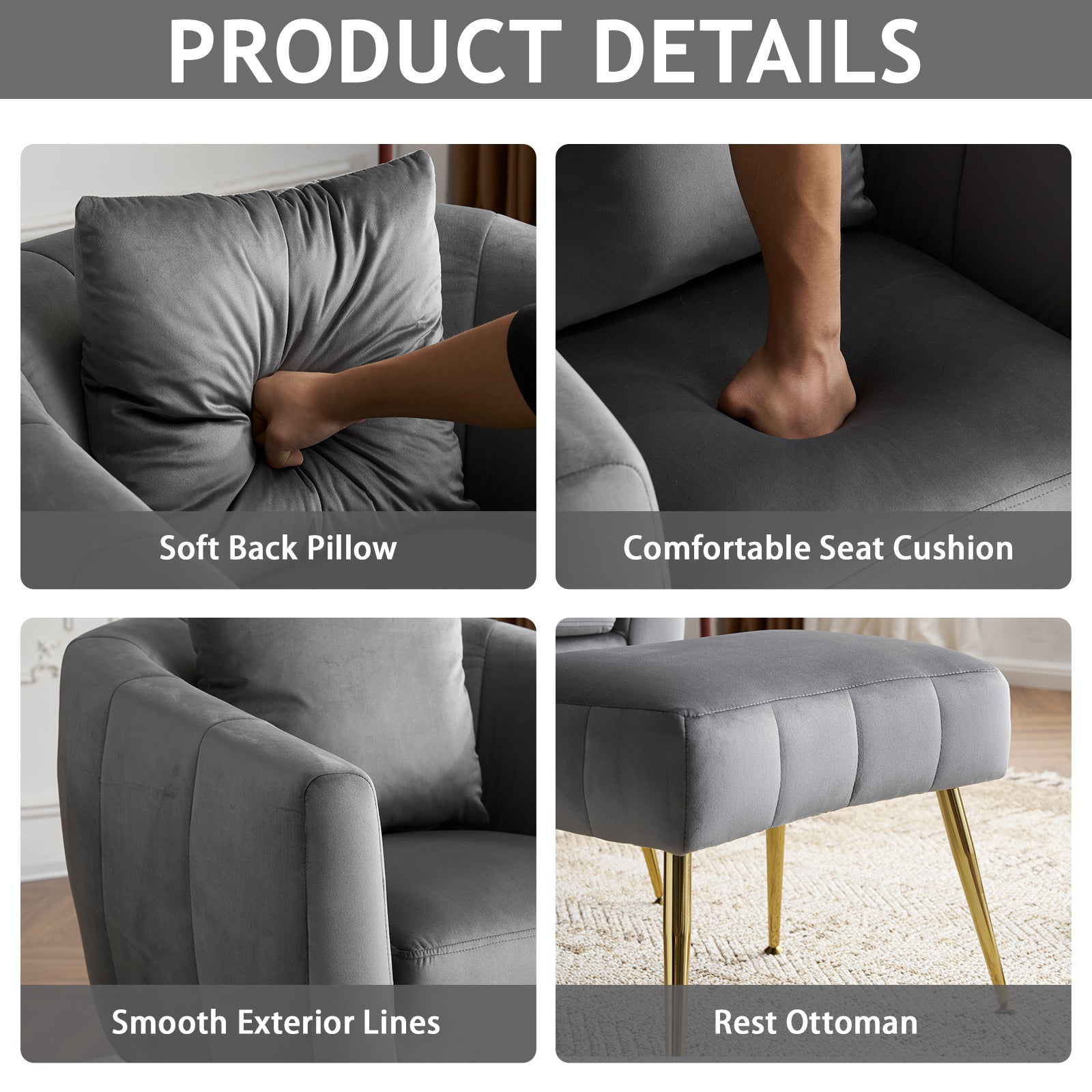 Velvet Barrel Chair with Ottoman & Lumbar Pillow – Gray Accent Set