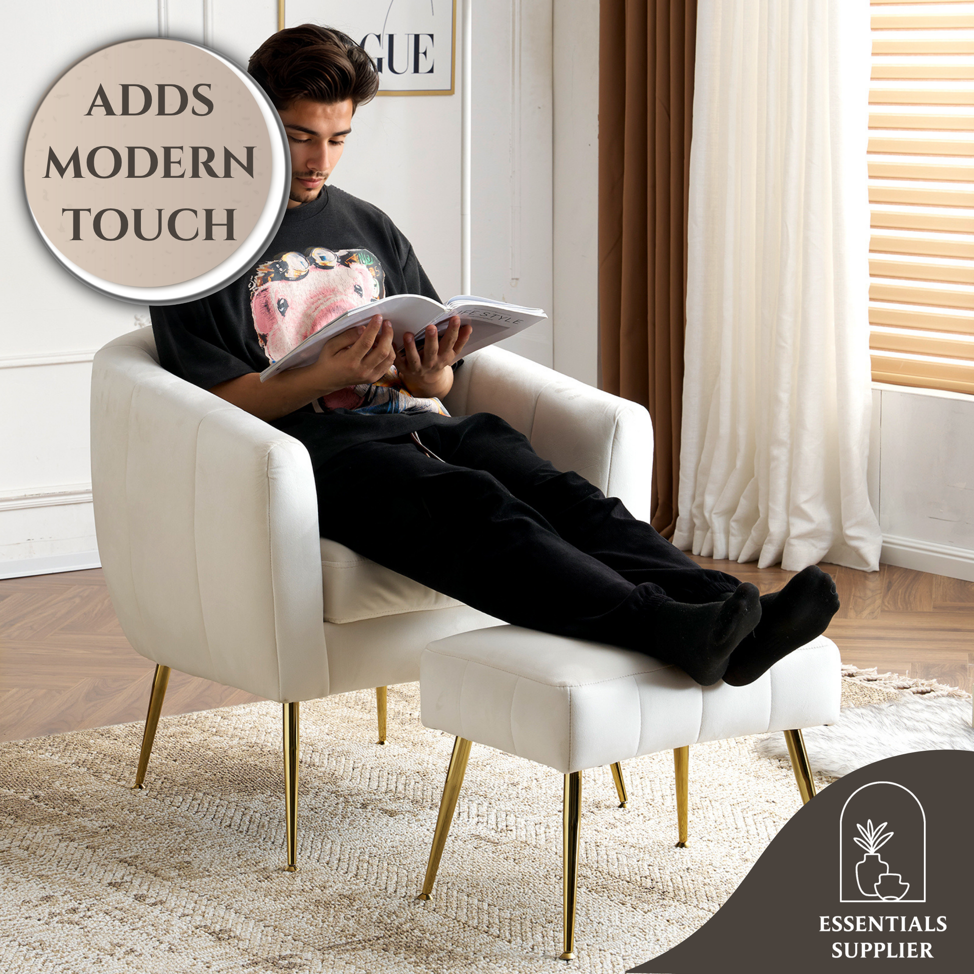Velvet Barrel Chair with Ottoman & Lumbar Pillow – Off White Accent Set